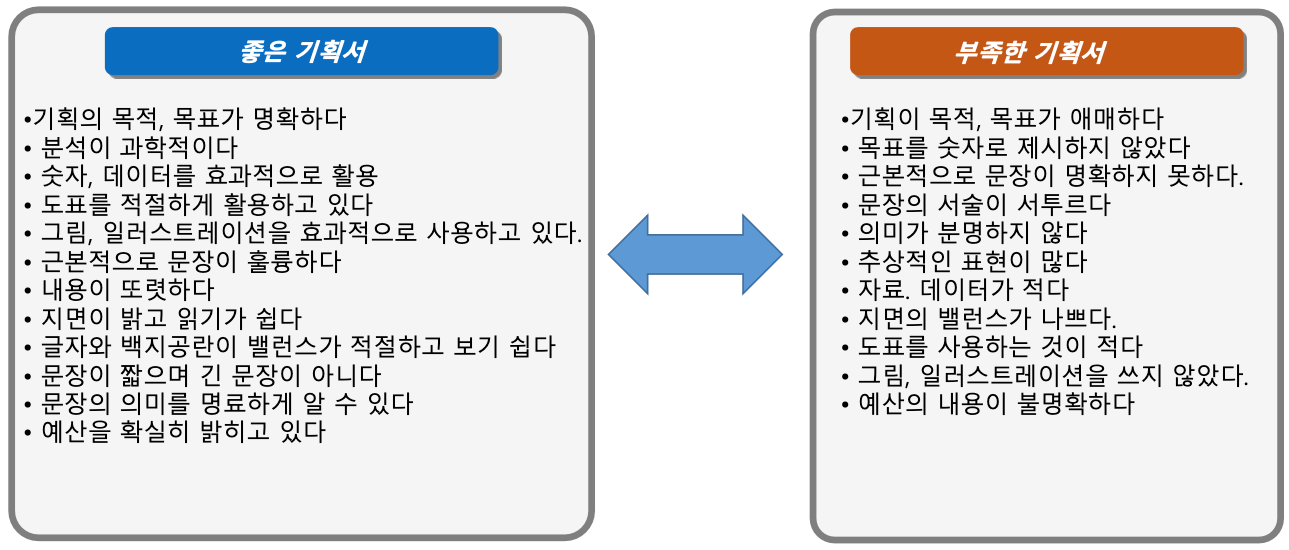 좋은 기획서와 부족한 기획서를 구분해보면 다음 사진과 같다.