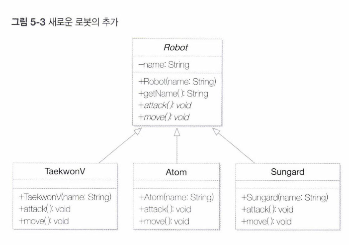 다이어그램의 구조를 보면 TaekwonV 클래스, Atom 클래스 모두 Robot이라는 추상 클래스의 자식 클래스이다.