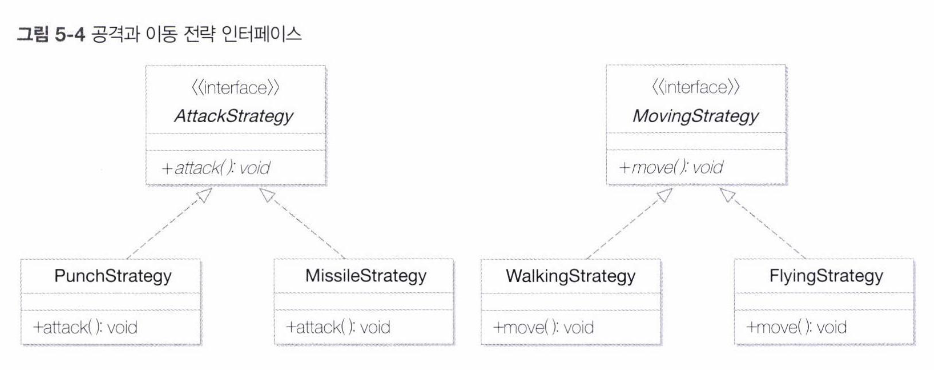 즉, 새로운 방식의 이동 및 공격 기능이 계속해서 추가될 수 있으므로, 기존의 로봇이나 새로운 로봇이 이러한 기능을 별다른 코드 변경 없이 제공받거나 기존의 공격, 이동 방식을 다른 기능으로 손쉽게 변경할 수 있어야 한다.