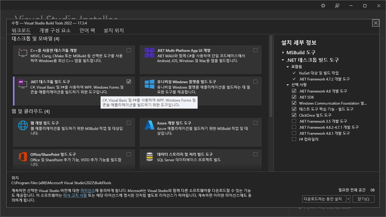 2022년 5월 이후부터는 Visual Studio Build Tools 2022를 통해 .net 데스크톱 빌드 도구를 설치해주어야 한다.