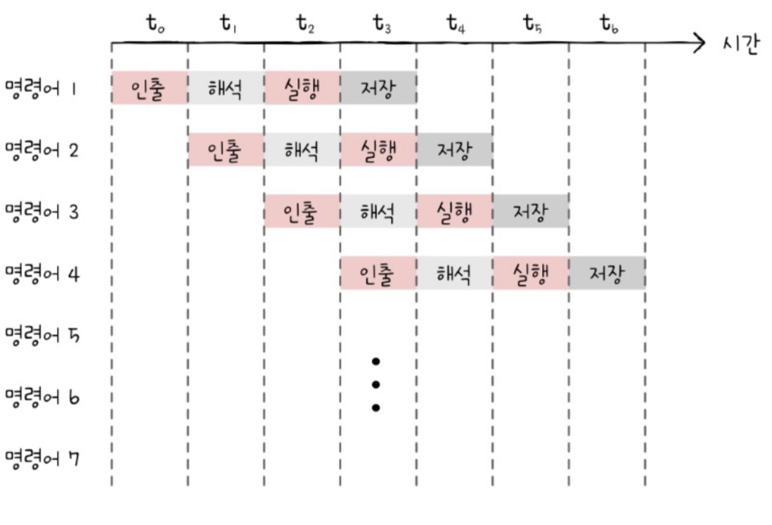 동시에 여러 명령어를 인출, 해석, 실행할 수 있는 구조이기 때문이다.