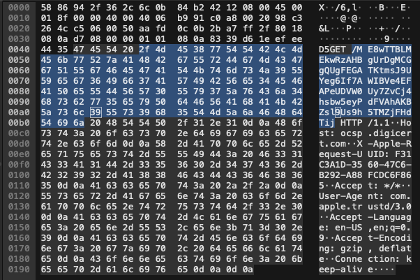그 옆에 있는 패킷 데이터 영역은 송수신한 데이터의 내용, 통신 데이터로 전송된 요청 문자가 표시된다.