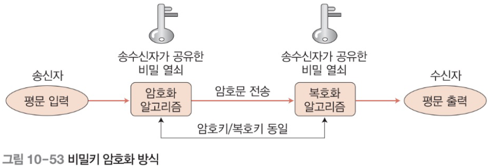 암호키와 복호키가 동일하여 두 개체가 같은 키를 공유하며 하나의 키를 사용해 암호화/복호화한다.