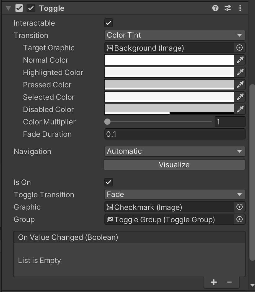 위 사진은 클릭된 Toggle의 Inspector 창을 찍은 것입니다.