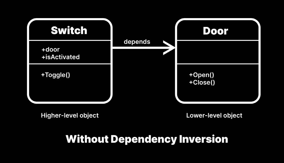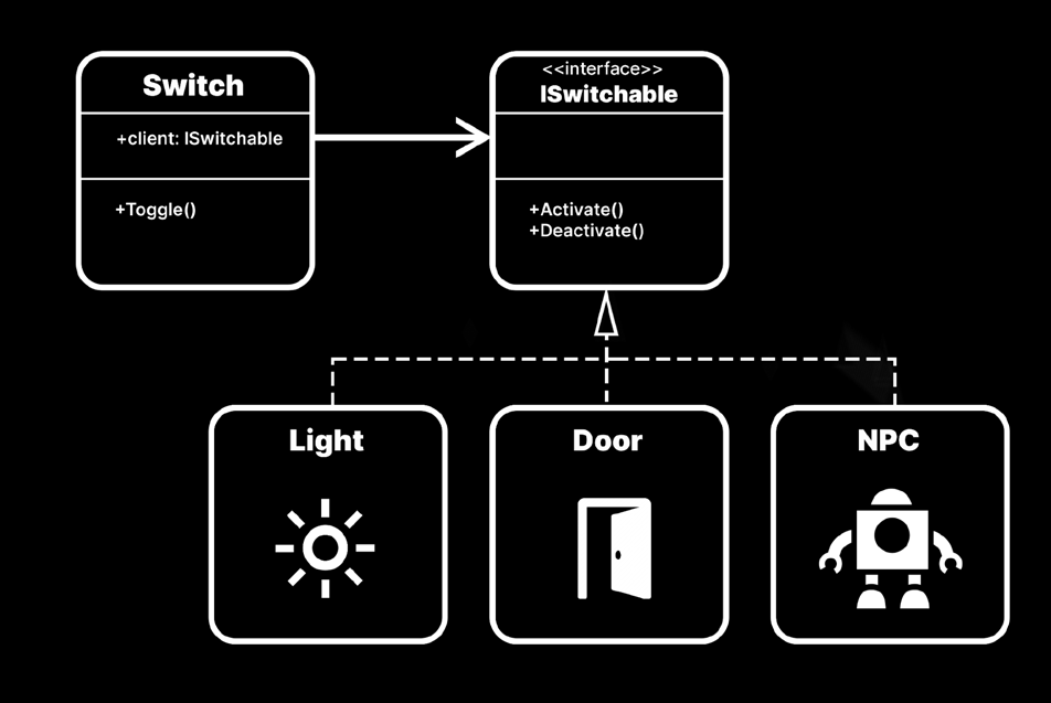 Switch 클래스는 문을 여닫기 위해 Toggle 메서드를 호출합니다. 물론 잘 동작은 합니다만, Door 클래스에서 Switch 클래스로 직접적인 종속성이 연결되어 있다는 문제가 있습니다. 만약 Switch 클래스가 단순히 예시로 든 문을 여닫는 로직 외에 전등을 제어하거나 거대한 로봇을 조작하는 것 같은 더 많은 기능을 수행해야 한다면, 어떻게 될까요?