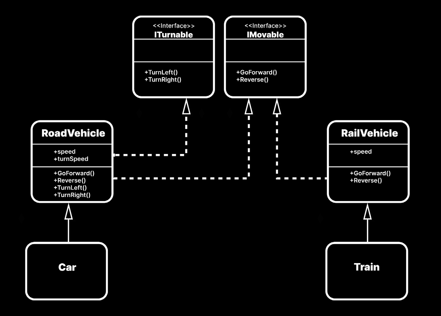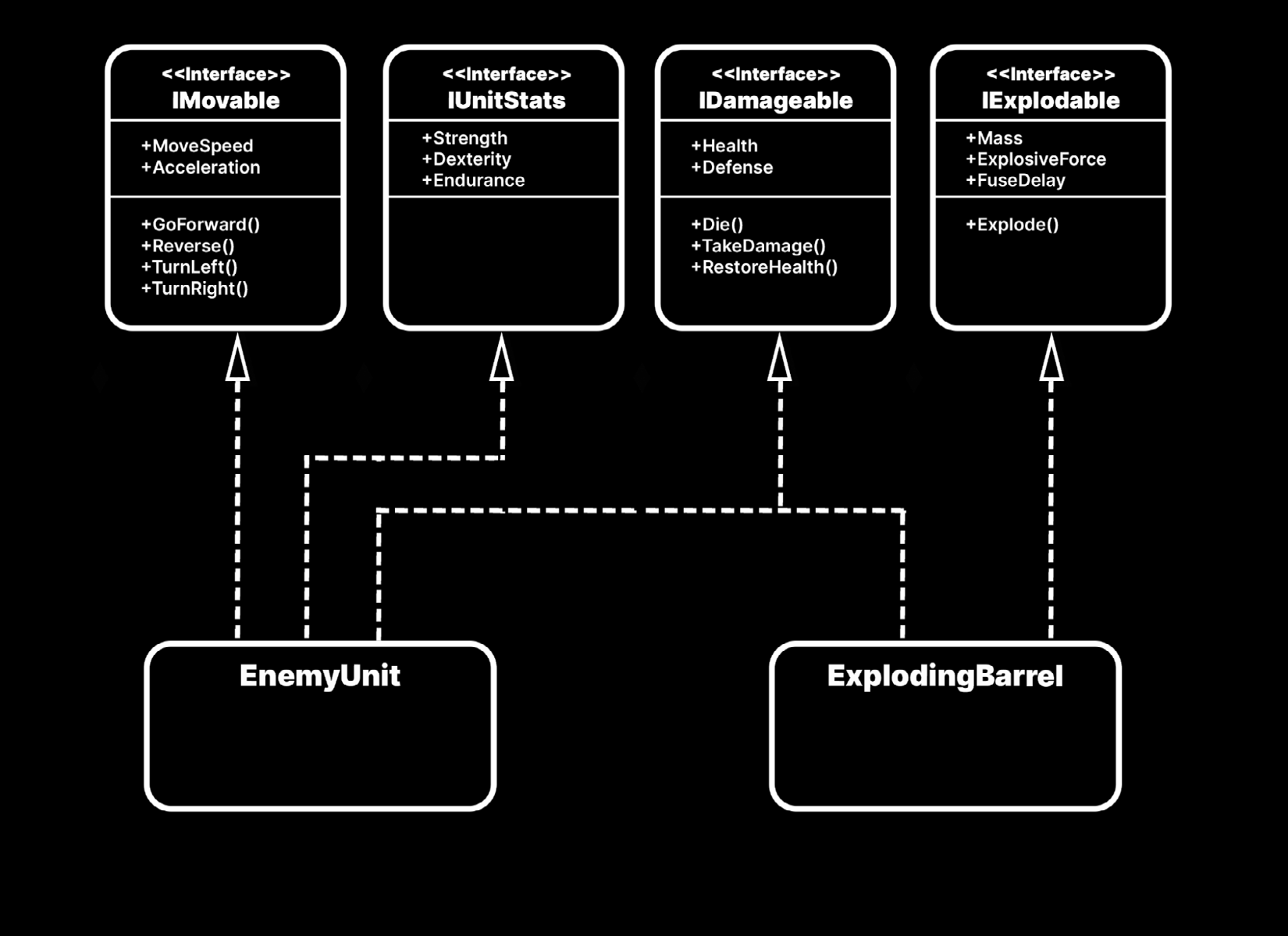 클래스는 한 개 이상의 인터페이스를 구현할 수 있기 때문에, IDamageable, IMoveable, IUnitStats 인터페이스를 사용해 적군 유닛을 구성할 수 있습니다.