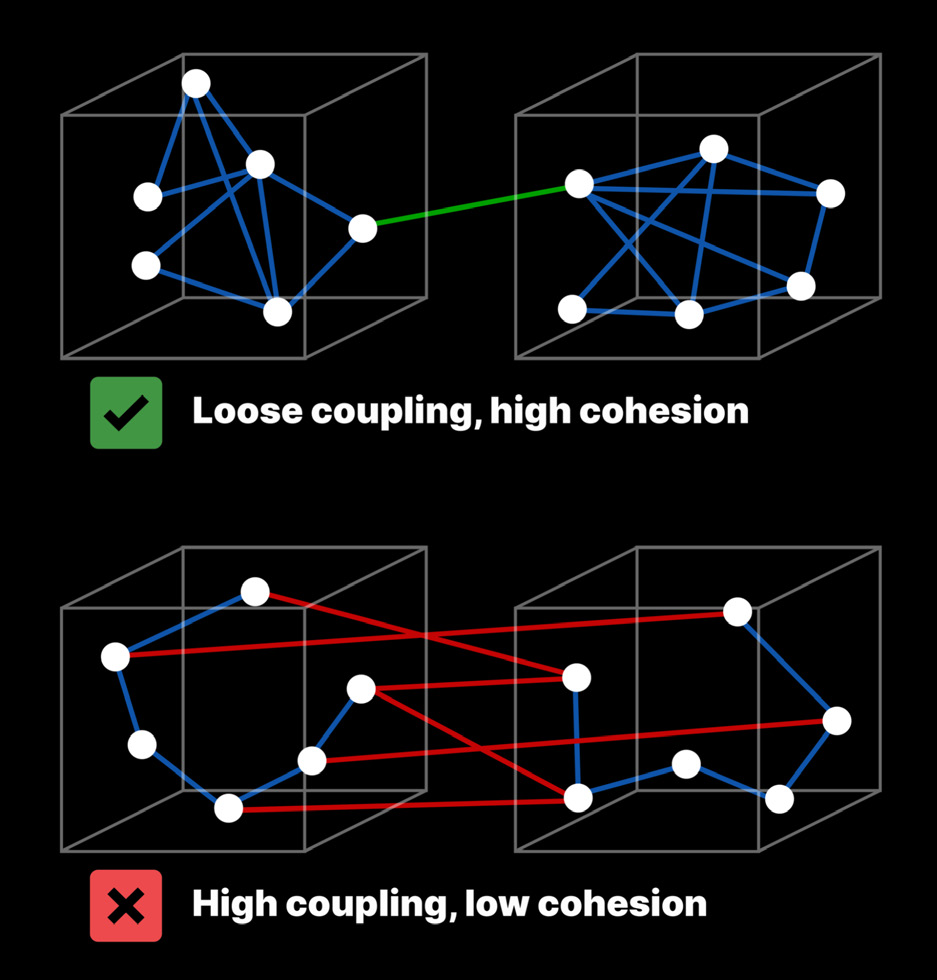 최적의 시나리오는 느슨한 결합도와 높은 응집력을 추구하는 것입니다.