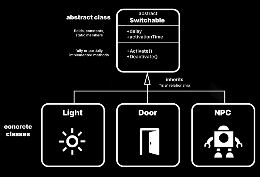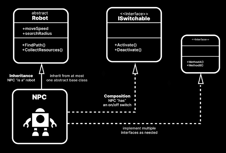 다음의 예시를 보면, 추상 클래스인 Robot 부모 클래스로부터 파생된 NPC 클래스를 만들었습니다. 하지만 ISwitchable 인터페이스를 사용하여 NPC를 켜고 끌 수 있는 능력도 추가해 주었죠.