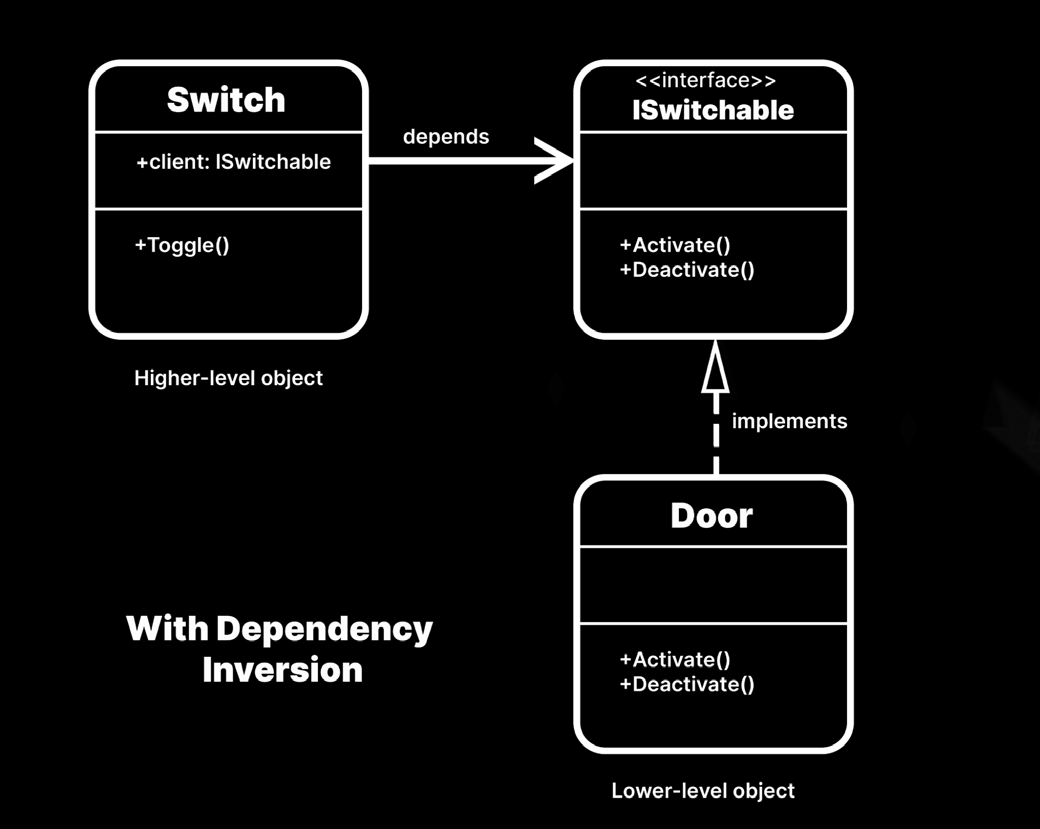 이제 여러분은 종속성을 반전시켰습니다. 인터페이스는 Switch 클래스와 Door 클래스 사이에 강한 종속성을 지니도록 만드는 것 대신, 클래스들 사이에 추상화를 생성하였습니다. Switch 클래스는 더 이상 직접적으로 문을 조작하는 것에 특화된 메서드(Open, Close 메서드)와 연관되어 있지 않습니다. 그 대신 ISwitchable 인터페이스의 Activate와 Deactivate 메서드를 사용하고 있죠.