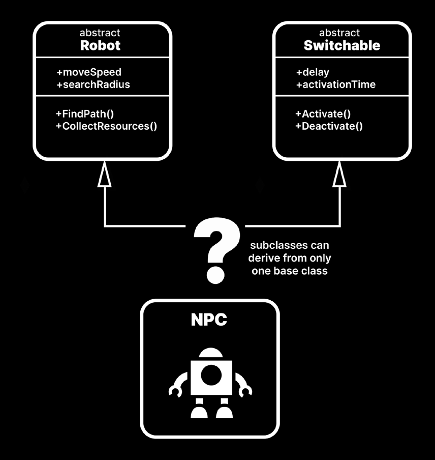 만약 여러분의 게임 속 모든 로봇에 대한 또 다른 추상 클래스가 있다면, 어떤 추상 클래스를 상속해야 하는지 결정하기 난감할 것입니다. Robot 또는 Switchable 부모 클래스 중 어떤 걸 사용해야 할까요?