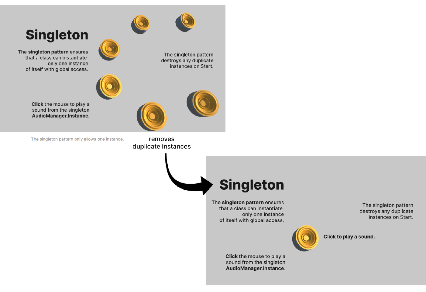 이를 활용하여 씬 내에 존재하는 모든 게임 오브젝트가 언제나 접근할 수 있는 매니저 오브젝트(게임 플로우 매니저 또는 오디오 매니저 등)를 제작할 수 있습니다. 또한, 만약 오브젝트 풀을 구현했다면, 여러분이 구현한 오브젝트 풀링 시스템 코드에 싱글톤 패턴을 적용하여 보다 쉽게 오브젝트를 풀링할 수 있도록 만들 수도 있습니다.