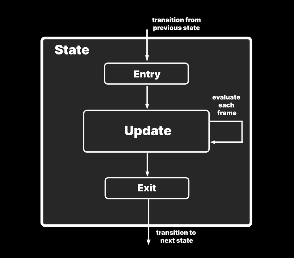 - 각각의 상태는 게임이 실행되는 동안 변화하는 조건에 따라서 다른 상태로 넘어가게 만드는 트리거를 가질 수 있습니다.