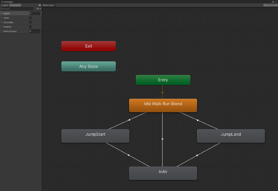 만약 Unity 엔진에 내장된 Animator 창을 사용해 본 적이 있다면, Animator 창의 워크플로(Workflow)가 상태 패턴과 잘 어울린다는 것을 알아채셨을 것입니다. 각 애니메이션 클립은 하나의 상태를 나타내며, 한 번에 하나의 상태만 활성화될 수 있습니다.