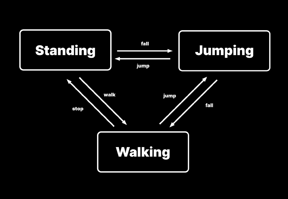 플레이어가 조작할 수 있는 캐릭터(Playable Character)를 제작하는 과정을 상상해 봅시다. 이 캐릭터는 땅 위에 서 있을 수도 있고, 컨트롤러를 조작해 달리거나 걸어 다닐 수도 있습니다. 점프 버튼을 누르면 캐릭터는 공중으로 뛰어오릅니다. 몇 프레임이 지나면 캐릭터는 땅 위에 서게 되고 대기 상태, 즉 서 있는 상태로 다시 진입합니다.