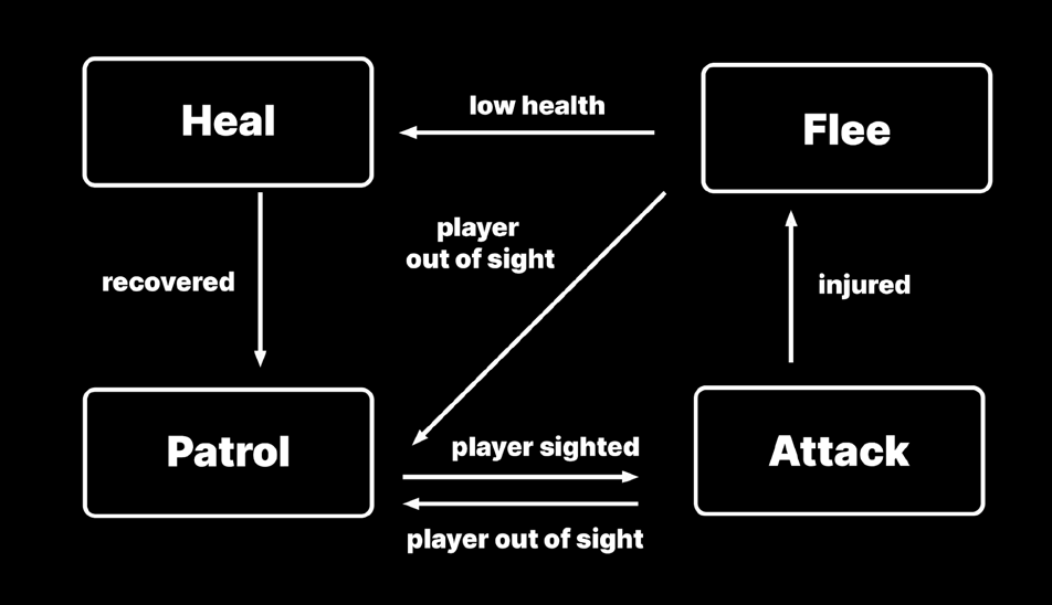 - 간단한 AI 구현하기: 유한 상태 머신은 기초적인 수준의 적 AI를 제작하는 데에도 유용하게 활용할 수 있습니다. NPC의 두뇌를 FSM 접근법을 통해 제작한다면 아래와 같은 그림이 그려질 것입니다: