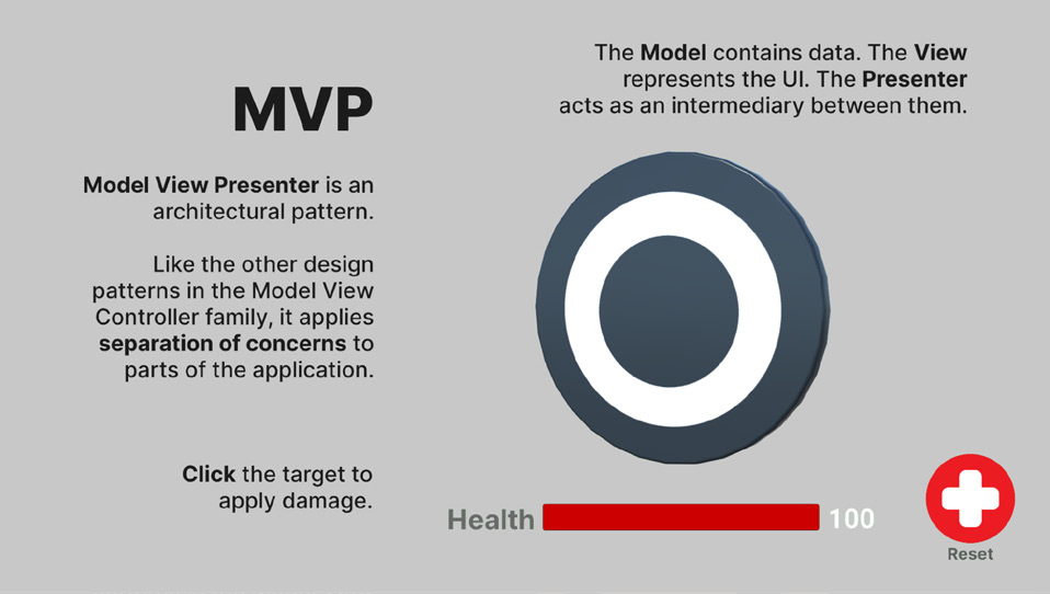 샘플 프로젝트에서는 사용자가 타깃 오브젝트를 클릭하여 대미지를 주거나, 초기화 버튼을 눌러 체력을 초기화할 수 있습니다. 이는 Health에 직접 접근하여 값을 수정하는 것 대신, (Damage 메서드 또는 Reset 메서드를 깨우는) HealthPresenter를 사용합니다. UI 텍스트와 UI 슬라이더는 Health가 이벤트를 일으켜서 HealthPresenter에 값이 변경되었음을 알릴 때 업데이트됩니다.