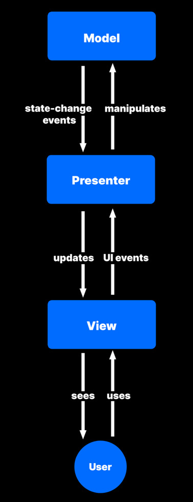 MVP 패턴에서 프레젠터(Presenter)는 (MVC에서는 컨트롤러)다른 레이어 간의 중계자 역할을 수행합니다. 이는 모델에서 데이터를 검색하고 뷰가 데이터를 표시할 형식을 지정합니다. MVP는 어떤 레이어가 입력을 제어할 것인지를 조정할 수 있습니다. 컨트롤러 대신, 뷰가 사용자의 입력을 처리합니다.