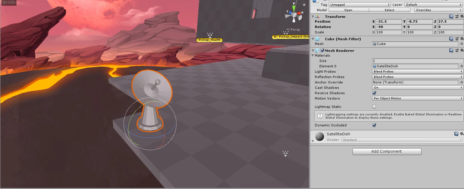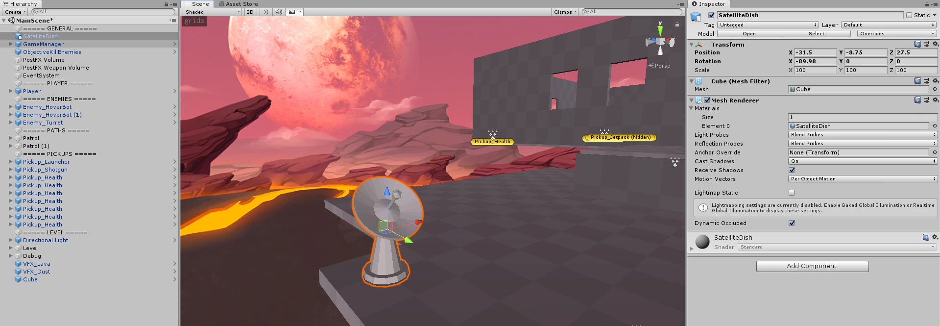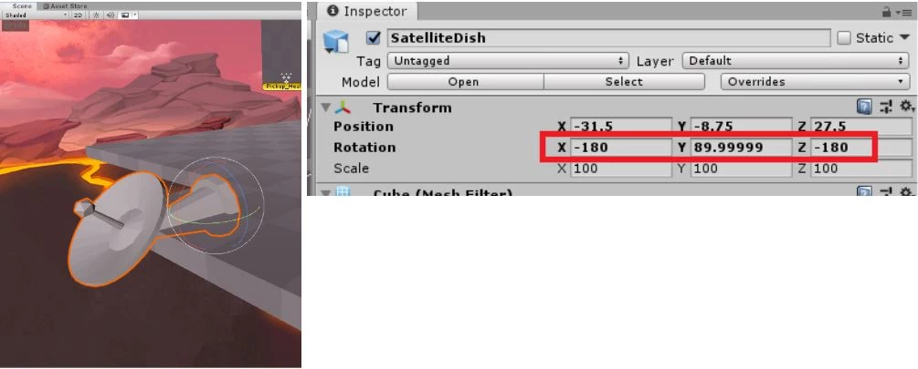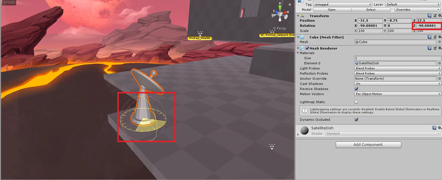 SatelliteDish의 밑부분이 보이신다면, 프리팹을 이동 및 회전시켜 적합한 위치에 배치하시면 됩니다!