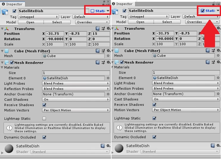 Hierarchy 창에서 오브젝트를 클릭하시고, Inspector 창에서 "Static" 토글을 클릭해주세요.