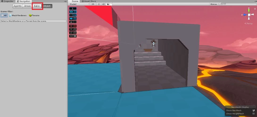 해당 과정에 대한 자세한 내용은 FPS Mod: Creating the Navigation Mesh 튜토리얼을 참고하시면 되나, 지금 바로 NavMesh를 '굽고' 싶으시다면, 아래의 지침을 따라주세요.