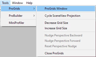 ProGrids Window가 Scene 뷰에 나타나지 않는다면, "ProGrids Window"를 클릭하시면 항상 현재 프로젝트 내에 표시됩니다.