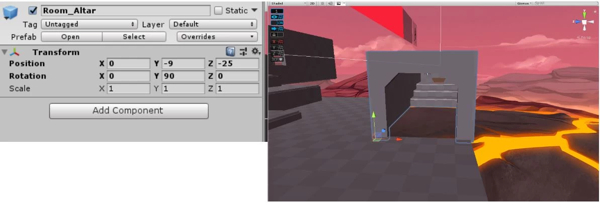 Room_Altar 프리팹을 배치했던 것과 동일한 방법으로 Move 도구와 Rotate 도구를 이용해 바닥을 제단에 배치시켜주세요.