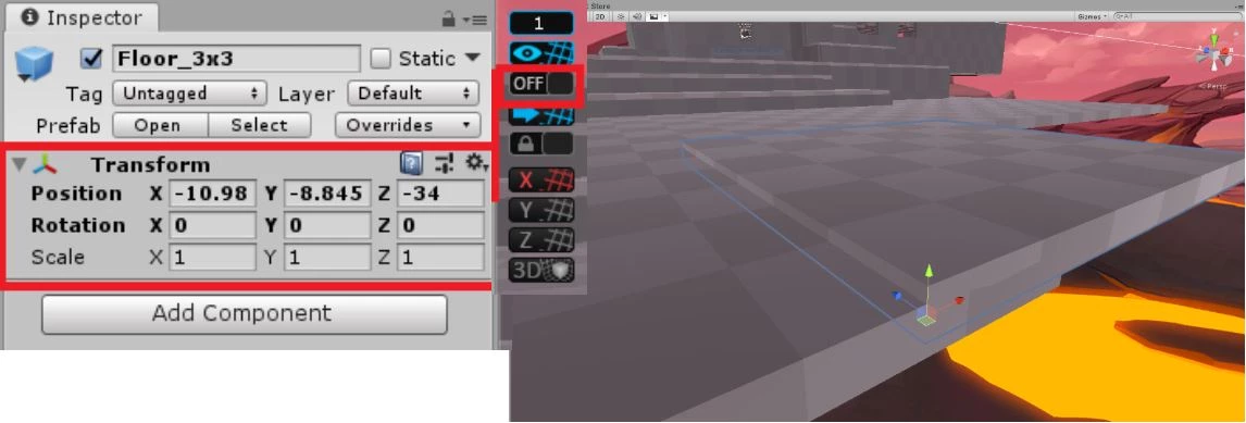 ProGrids가 꺼져있는 동안에는 Transform 값이 균일하지 않음에 유의해주세요.