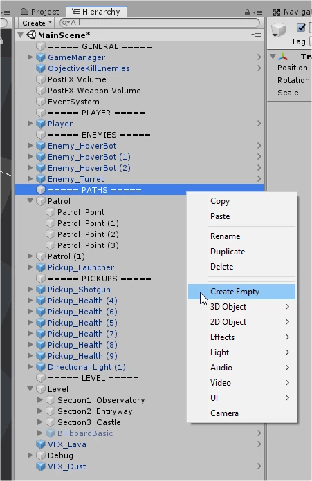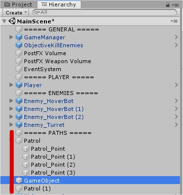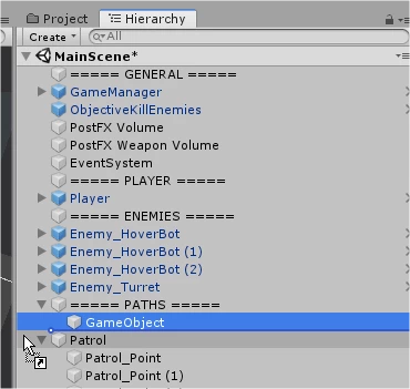 2) Hierarchy 창에서 "--PATHS--" 섹션을 찾으신 뒤, "Patrol" 게임 오브젝트를 더블 클릭해주세요.