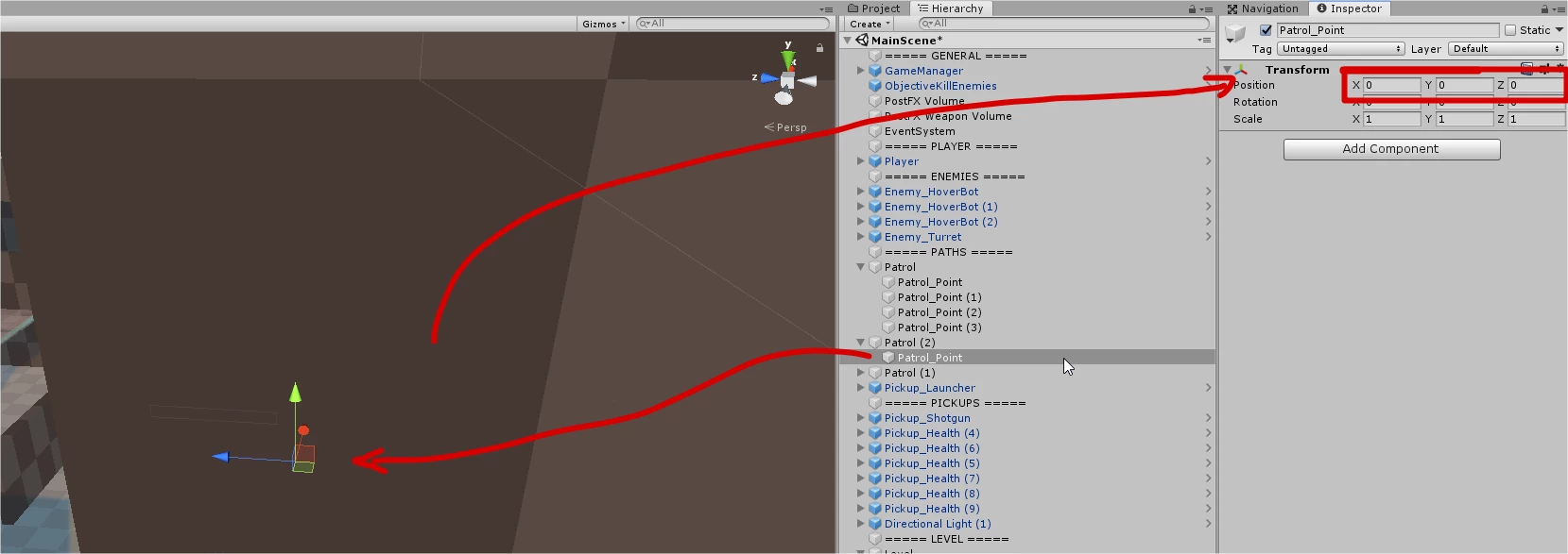 4) Scene 뷰에서 Move 도구를 사용해 Patrol_Point 게임오브젝트를 적이 움직이고자 하는 위치로 직접 드래그해주세요.