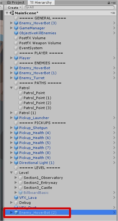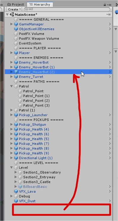 3) 생성된 적 오브젝트를 Hierarchy 내의 'ENEMIES' 섹션으로 이동시켜주세요.