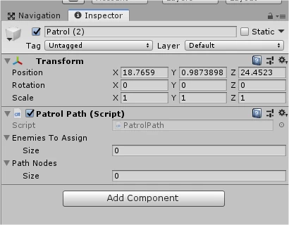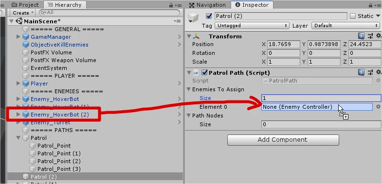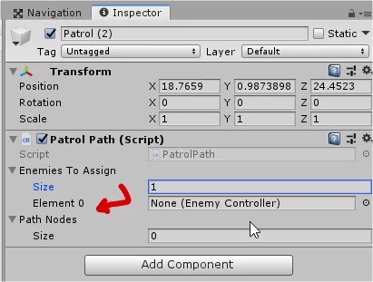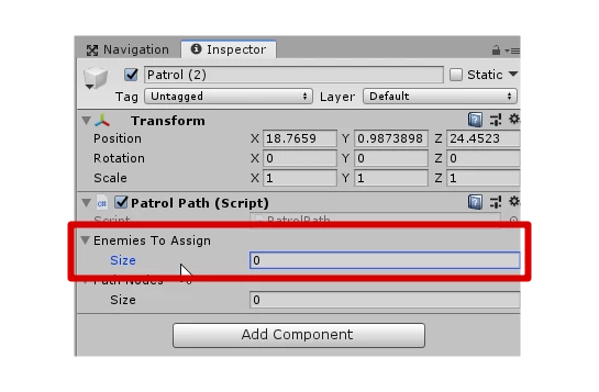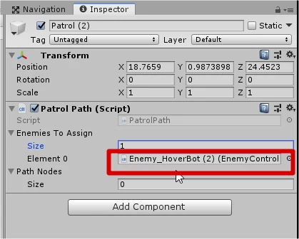 다음으로, 적에게 Patrol Path 스크립트를 할당시켜줍시다.