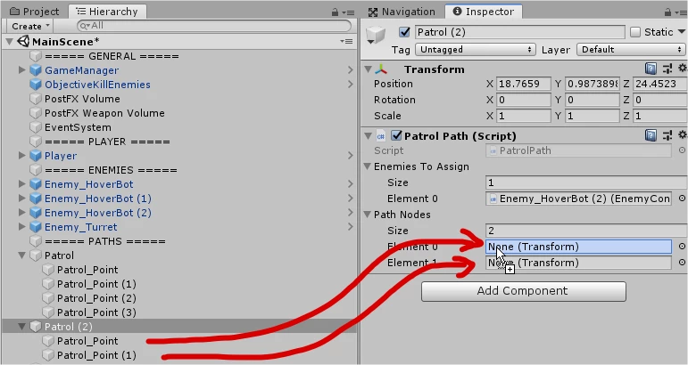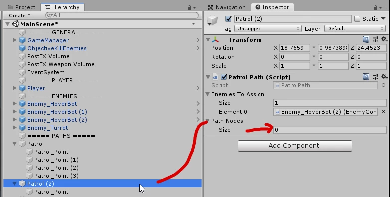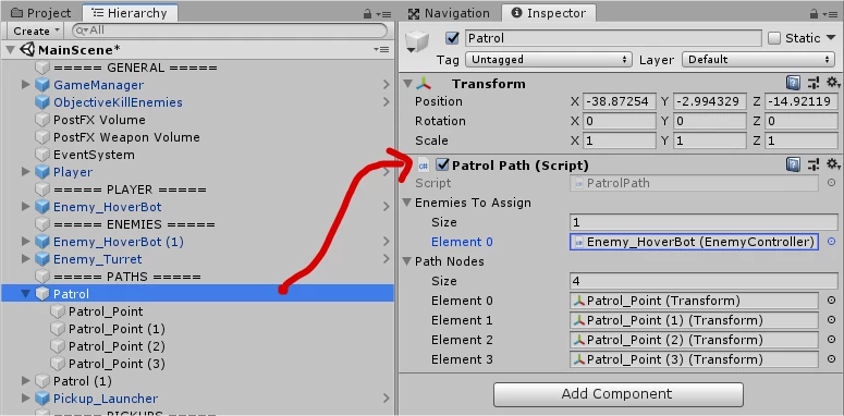 마지막으로, Patrol Path 스크립트에 Patrol Points를 할당시켜줍시다.