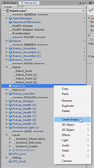 이전 단계에서 제작하셨던 "Patrol (2)" 게임오브젝트를 선택하시고, 빈 게임오브젝트를 자식 오브젝트로 생성해주세요. (마우스 우클릭 후 "Create Empty" 선택)