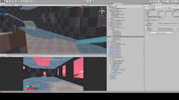 If you place an Enemy into the scene and enter Play, you will notice that it will remain in place until you come close to it, at which point it gets alerted and will attack you. That’s because your new enemy does not yet have a “patrol path” assigned. In t