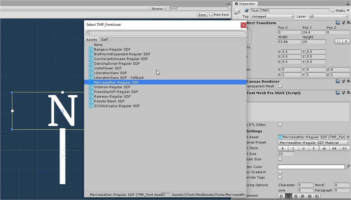 3) Inspector 창에서 게임오브젝트 상의 Text Mesh Pro UGUI 컴포넌트를 찾아주시고, Font Asset 필드 옆의 아이콘을 클릭해주세요.