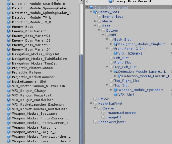 튜토리얼 상에서는, "Enemy_Boss_Variant01"을 선택했습니다: Enemy_Boss_Variant01 > Enemy_Boss > Root > Bottom > Mid > Top_Slot > Weapon_Module_EyeLazers