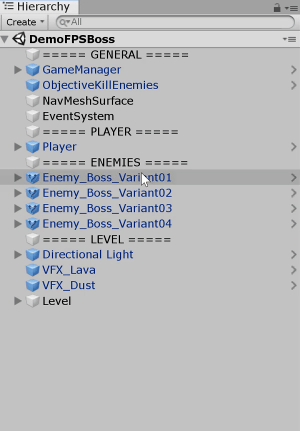 2) 이제 Hierarchy 창에서 ENEMIES 섹션 아래의 "Enemy_Boss_Variant*" 프리팹들 중 하나를 선택해주세요.